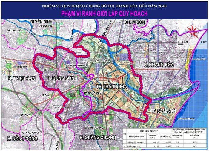 Theo đó, quy hoạch chung đô thị Thanh Hóa đến năm 2040 phạm vi quy hoạch gồm toàn bộ địa giới. hành chính thành phố Thanh Hóa và huyện Đông Sơn với quy mô diện tích khu vực khoảng. 228,28km2, dân số hiện trạng gồm cả quy đổi khoảng 580.000 người. Thành phố Thanh Hóa hiện có 20 phường và 14 xã. Huyện Đông Sơn có 01 thị trấn và 13 xã.
